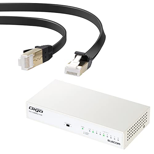 LANケーブルセットには、2mのcat7 LANケーブルと、エレコム製ギガビット8ポートスイッチングハブ(EHC-G08MN2-HJW)が含まれています。金属筐体でマグネット付き、電源内蔵のホワイトモデルです。