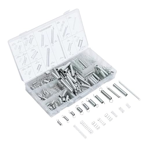 スプリングセットは約200個入りで、引きバネ12サイズと押しバネ8サイズが含まれています。収納ケース付きで、圧縮ばねや引張りばね、コイルばねに適したバネのセットです。