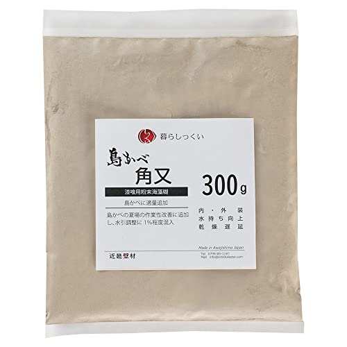 漆喰追加用粉末海藻糊 島かべ角又 300gは、漆喰の接着力を高める海藻由来の粉末です。水と混ぜて使用し、施工性を向上させます。環境に優しく、効果的な仕上げを実現します。