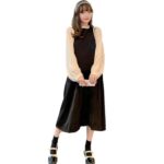 エバーオリーブのレイヤード風ロングワンピース。異素材ドッキングで長袖フレアデザイン、体型カバー効果あり。マタニティにも対応し、リボンやクルミボタン、バックリボン付き。カラーはブラック。サイズはXLです。