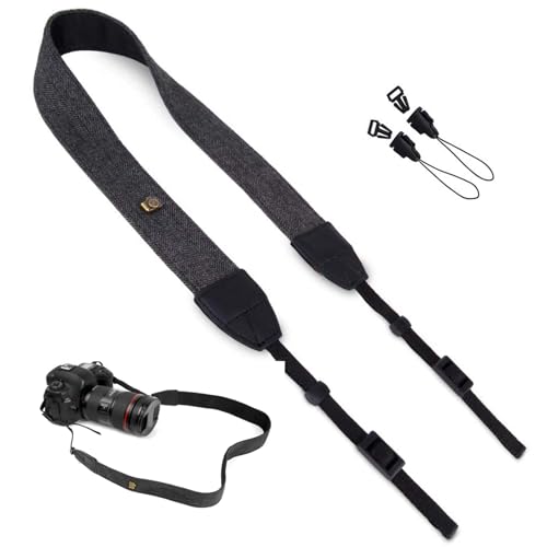 DFsuccesのカメラショルダーストラップは、長さ調整可能で滑り止め機能付き。一眼レフや高級コンパクトカメラ、デジカメに対応した接続アダプタ付き。カラーはブラック。