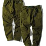 ジェリー[GERRY]のギアパンツは、クライミングやキャンプに最適なストレッチデニム素材のテーパードパンツです。メンズ用で、Lサイズのカーキ色。動きやすさを追求したデザイン。