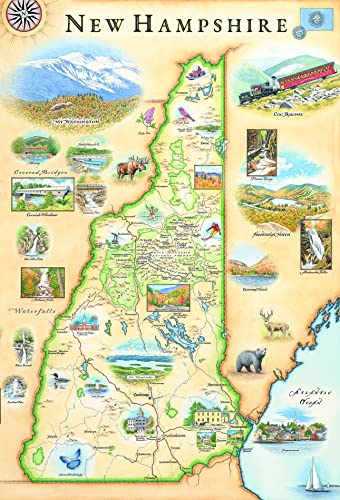 ニューハンプシャー州の手描きマップポスター。18×24インチのビンテージスタイル、歴史や旅行好きに最適。米国製の大豆インク使用のリトグラフプリント。