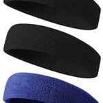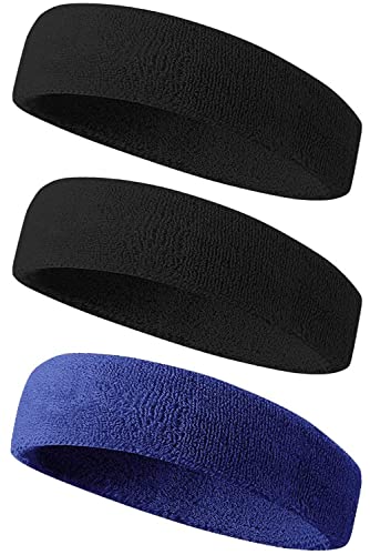 エココットン素材のメンズヘアバンド3本セット。吸収性・通気性に優れ、ランニングやダンス、ヨガに最適。伸縮性あり、軽量で速乾性。カラーはブラック2本とネイビー1本。