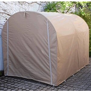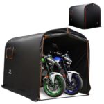 バイクガレージのMサイズは、簡単に組み立てられ、ロープホール・ペグ・重石カバーで固定可能。耐水圧3500mm、難燃加工、両面開きで大型バイクも収納できるブラックのサイクルハウス。