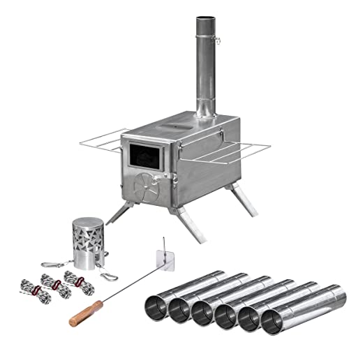 FIELDOOR薪ストーブはコンパクトに収納でき、折りたたみ脚と分割煙突付き。耐熱ステンレス製で、ソロキャンプや防災に最適。グリッド棚や灰かき棒も付属。