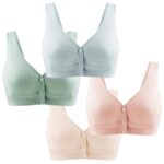 Joyancejtのマタニティブラ4枚セット。前開きデザイン、柔らかな綿素材で快適。ナイトブラとしても使用可。ノンワイヤー、無地デザインで、2Lサイズ(グリーン、ライトブルー、ベージュ、薄ピンク)を展開。