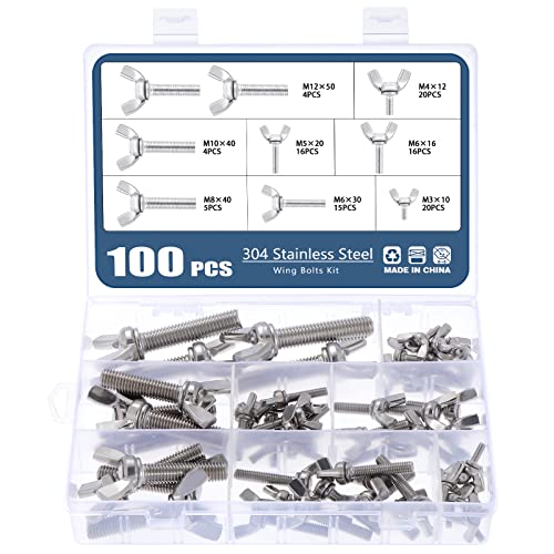 100個入りの8サイズウィングボルトキット。304ステンレス製で、M3からM12までのメトリックサイズ。蝶ネジデザインで使いやすく、耐久性に優れたファスナーです。