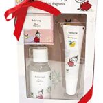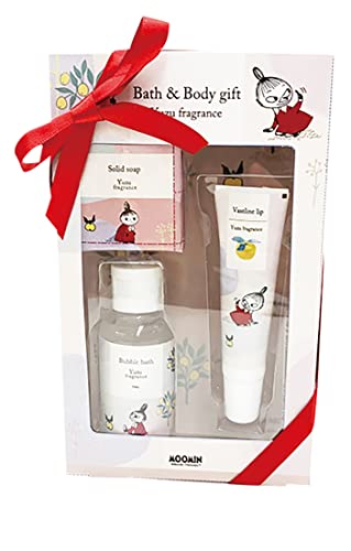 ほんやら堂のMOOMINゆずバス&ボディケアギフトセット。ソープ、バブルバス、ワセリンリップが含まれ、サイズは約W18 D11 H4.5cm。可愛らしいイエローのパッケージです。