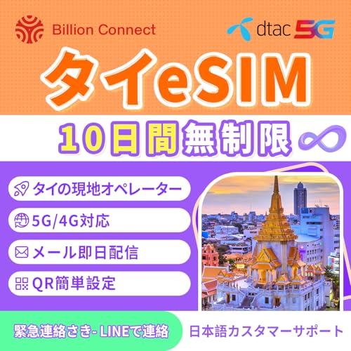 タイで10日間無制限データが使えるeSIM。TikTokやChatGPT、Google利用可。5G/4G対応、dtacのネットワーク使用。QRコードで即日メール送付、簡単インストール。LINEサポートあり、契約不要。