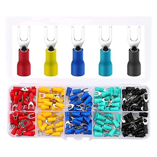 PENGLIN製の絶縁被覆付Y型圧着端子セットです。赤、緑、黄、青、黒の5色が含まれ、絶縁U型/Y型圧着端子と先開形フォーク端子があります。200個がセットになっています。