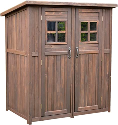 大型の木製屋外物置で、天然木を使用したダークブラウンのデザインが特徴です。ガーデニング用品やアウトドアグッズの収納に最適。耐久性があり、庭やテラスに美しく映えます。