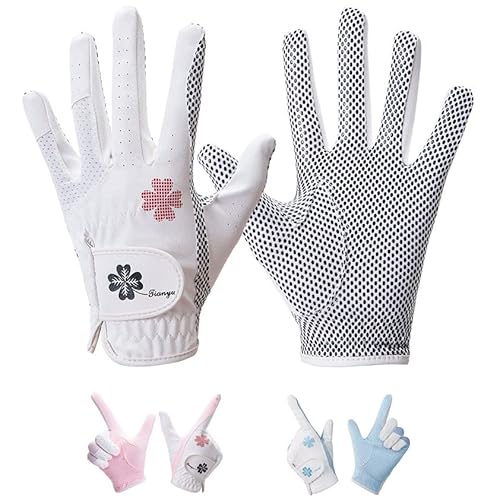 ゴルフグローブ レディース 両手用。高いグリップ力と通気性を兼ね備えたPUレザーとマイクロファイバー素材使用。サイズ19、カラーはブラック&ホワイトで、快適なプレーをサポートします。