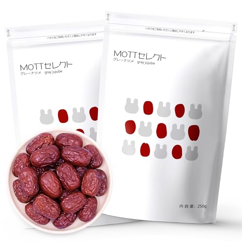 MOTTセレクトのグレーナツメは、無添加・無農薬の乾燥なつめです。250g×2袋で、濃い甘みとしっとりした食感が楽しめます。健康的なおやつとして最適です。