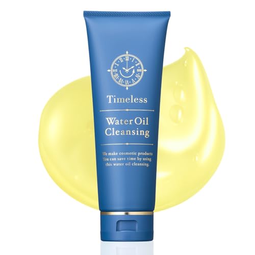 タイムレスウォーターオイルクレンジングは、頑固な毛穴汚れや黒ずみをしっかりオフ。ナイアシンアミド、レチノール、グルタチオン配合で、アロマな柑橘の香り。W洗顔不要、まつエクOK、乳化不要で、180gで約2ヶ月分。