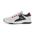 プーマ ゴルフシューズ フュージョン グリップ メンズ 23年秋冬カラー。カラーはプーマ ホワイト/プーマ シルバー/プーマ ネイビー。サイズ27.0 cm。快適な履き心地と優れたグリップ力を提供します。