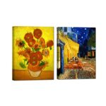 ゴッホの名作『夜のカフェテラス』と『ひまわり』をモチーフにしたポスターアートパネル。印象派油絵を背景にした木枠付きの完成品で、壁掛けやインテリアに最適です。