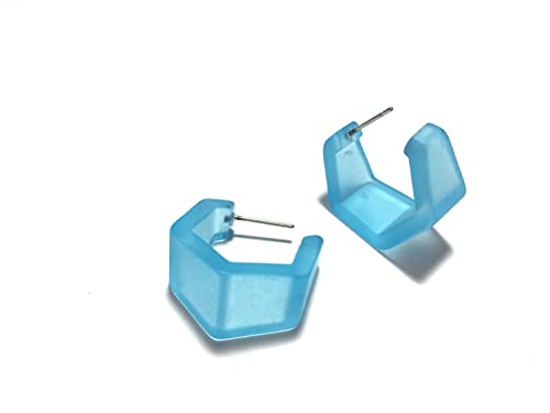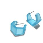 ターコイズフロスト六角ジオフープイヤリングは、ルーサイトとサージカルスチールを使用したアクリル製のアクセサリーです。軽量でおしゃれなデザインが特徴です。