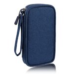 電子機器オーガナイザーバッグは、充電器やケーブル、イヤホンなどを整理できる耐衝撃ケースです。旅行に最適で、SDカードやUSB HDDも収納可能。色はネイビー。
