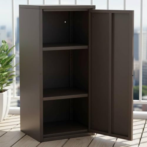 iimono117 小型倉庫は屋外用で、幅40×奥行34×高さ84㎝のサイズ。左・右開き可能のバルコニー収納庫で、調整可能な棚板2枚付き。ガーデニング用品や掃除用品、外遊び用おもちゃの収納に最適です。