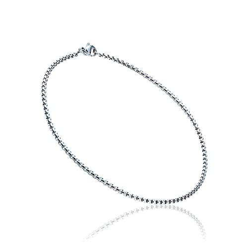 このブレスレットは、メンズ・レディース向けのシンプルなデザインで、幅2mmの細めのステンレス製ベネチアンチェーンです。長さは17cmで、つけっぱなしでもコーディネートしやすいシルバータイプです。