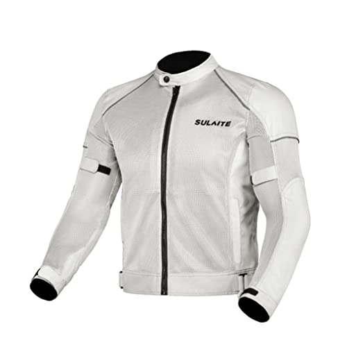 バイクジャケット、メッシュ素材で春夏秋用。CE2マーク取得の安全性。プロテクトソフトシェル、ショック吸収、耐久性高く、通気性良好。サイズL、カラーはホワイト。