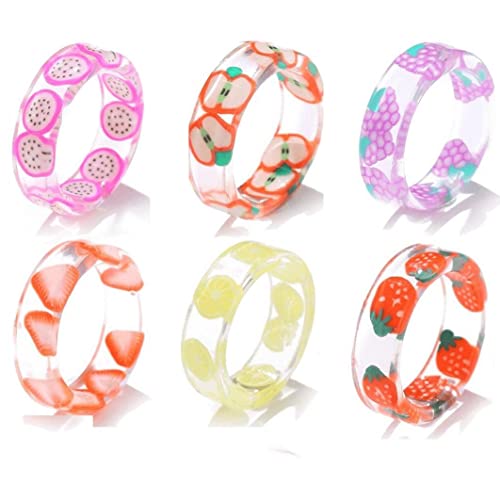 おしゃれでかわいい樹脂製のアクリルフルーツリングセット。透明なプラスチック素材を使用し、女性にぴったりな6個セット。カジュアルなコーディネートに彩りを添えるジュエリーです。