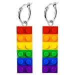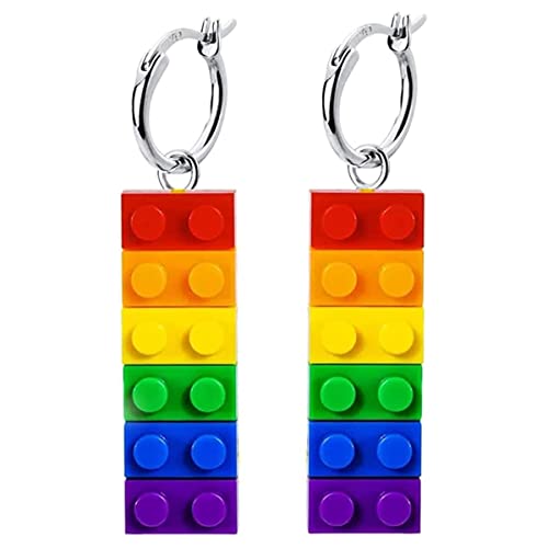 カラフルなレンガ模様のハンドメイドダングルフープイヤリング。軽量で、女性にぴったりのキューブブロックデザイン。アクリル素材で宝石なし。おしゃれでユニークなアクセントに最適。