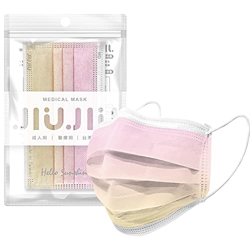 JIUJIUグラデーションシリーズの5枚入りマスクは、サージカル不織布で99%ウィルスカット。普通サイズ(175mm×95mm)で、サンセットピンクの血色マスク。食品インク使用でおしゃれ。台湾製の人気商品です。
