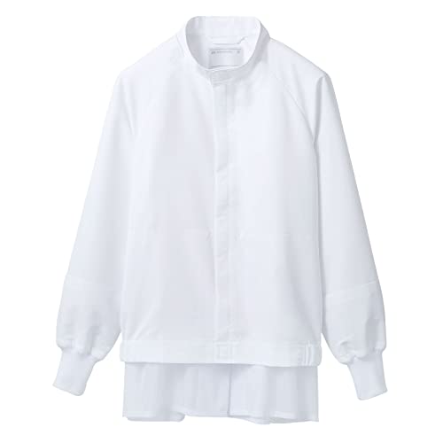 モンブランの食品工場向け白衣ジャンパーは、男女兼用で立体設計。高温作業環境に適し、スムースフィット、ネット付き、制電機能あり。薄手素材で吸汗速乾、イージーケア。RL8701-2 Sサイズ。