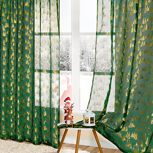 クリスマスシアーカーテン リビングルームとベッドルーム用 84インチ – ゴールド箔プリント クリスマスツリースター セミシアー ボイルカーテン 2パネル クリスマスグリーン チュールロッドポケット ウィンドウドレープ (52 x 84インチ、グリーン)の製品情報