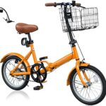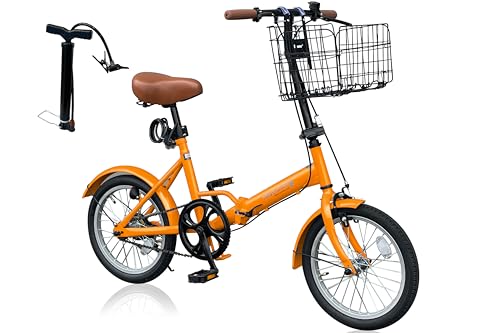 AIJYU CYCLEの16インチ折りたたみ自転車。軽量デザインで、着脱可能なカゴやミニベロ、折りたたみハンドル、前照灯、ワイヤーロックが付属。カラーはオレンジで、プレゼントにも最適です。