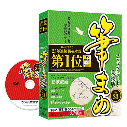 【2023年版】筆まめVer.33は、年賀状やハガキ作成、住所録管理に最適なソフトです。アップグレードや乗換えも可能で、ガイドブックとDVD-ROMが付属。Win対応版。