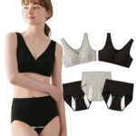 ANGELIEBEのマタニティ入院準備5点セット。授乳ブラ2枚、産褥ショーツ3枚、ハーフトップブラが含まれ、Mサイズ・ブラック杢グレーで提供。おしゃれで機能性も備えたアイテムです。