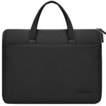 TREXPUREのパソコンバッグは、15.6-16.1インチ対応で撥水・軽量・耐衝撃設計。シンプルなデザインで手提げ・肩掛け両用、外寸42.5cm*30cm*7cm、カラーはブラックです。