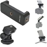 スマートフォン用のサポートシュー付き三脚ホルダー。180°の角度変更が可能で、1/4インチのチルトホットシュースタンドアタッチメントが特徴。動画や写真撮影に最適。