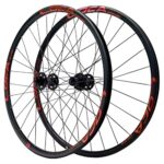 ロードバイクホイールセット 700c、スルーアクスル対応、ディスクブレーキ用。センターロック、ダブルウォールリム(21mm)、28ホール、ハブは7-12速カセットに対応。サイズは12*100/12*142mm、カラーはレッド。