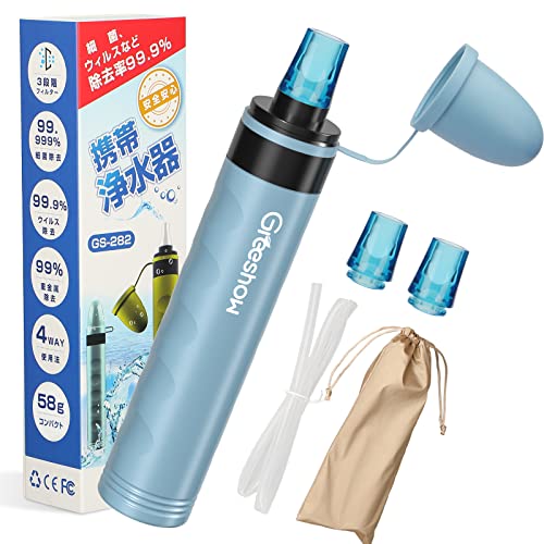 GreeShow GS-282 携帯浄水器は、防災やアウトドアに最適な軽量コンパクト設計。フィルター交換可能で再利用可能。地震や災害時の水を安全に飲める簡易浄水器。