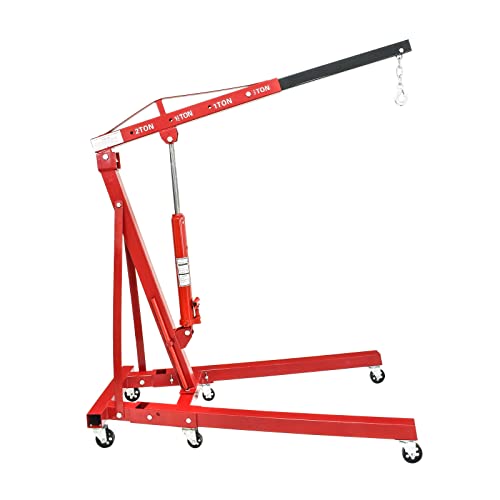 Fkstyleの油圧式エンジンクレーンは、6輪キャスター搭載で2tの耐荷重、4段階高さ調整可能なコンパクト設計です。自動車修理やエンジン脱着、メンテナンスに最適な赤色の整備工具です。