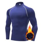 THREEGUNのコンプレッショントップス(メンズ)は、裏起毛でハイネックデザイン。長袖のスポーツインナーで、防寒性と通気性を兼ね備えています。ジムやアウトドアでの使用に最適な保温性を提供します。カラーはネイビー、サイズはLです。
