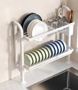 2段食器棚はステンレス製で耐久性に優れ、食器の水切りや収納に最適なラックです。サイズは58×25.5x37cmで、箸置きも付いています。キッチンを整理整頓し、スッキリとした空間を実現します。