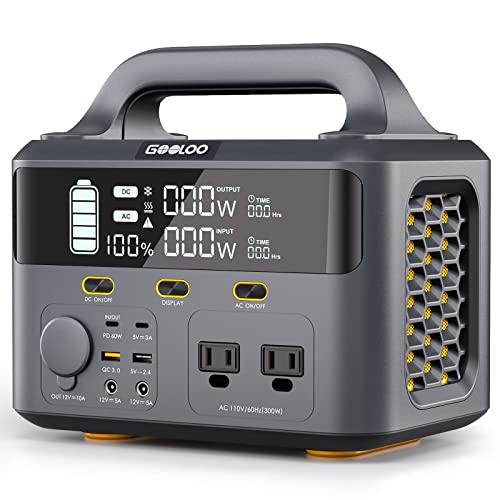 GOOLOOポータブル電源は299Wh/83200mAhの大容量。AC出力300W、瞬間最大600W、PD60W急速充電対応。コンパクトで軽量、IP65防水、5つの充電方法搭載。キャンプや防災用に最適。