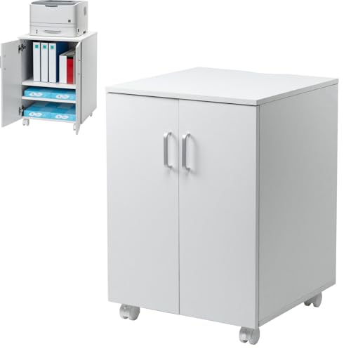サンワサプライのアウトレットプリンター台は、扉付きキャビネットで木製仕上げ。幅50cm、奥行50cm、高さ70cmの収納棚は、キャスター付きで移動が楽。オフィスに最適なデザインです。