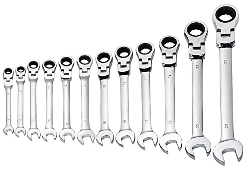 首振りフレックスラチェットギアレンチセット(12本)は、各種サイズのフレックスギアスパナとコンビネーションレンチが含まれており、効率的な作業をサポートします。