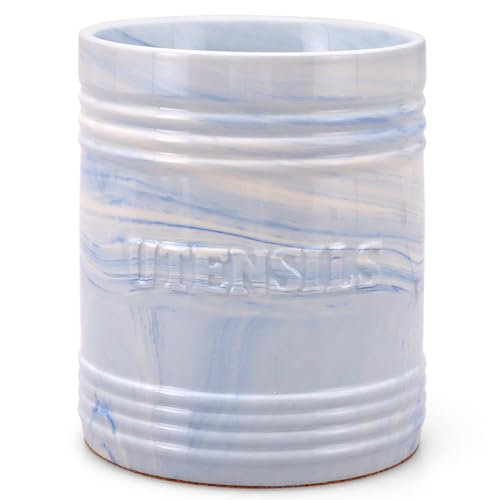 ベストブルーの大型セラミックキッチン用具入れは、食器や台所用品を整理するのに最適。カウンタートップに置けるデザインで、銀食器ホルダーとしても使えます。