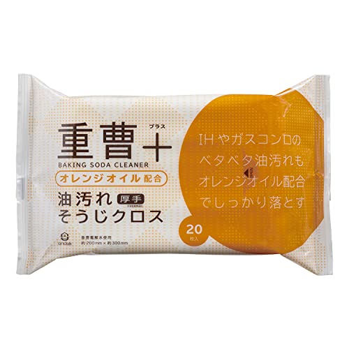 服部製紙の重曹電解水クリーナーは、油汚れの掃除に最適な厚手のシートです。サイズは約200×300mm、合成界面活性剤不使用でオレンジオイルを配合しています。20枚入り。
