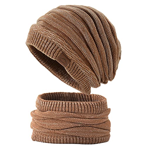 Andeorのネックウォーマー付きニット帽は、360度保温強化でふわふわの裏起毛。男性向けの冬用防寒具で、大きいサイズもあり、柔らかく伸縮性に優れています。カーキ色、スポーツやアウトドアに最適です。