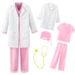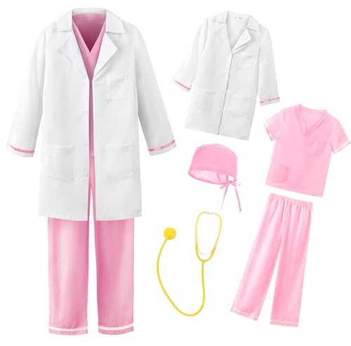 ReliBeautyの子供用医者ごっこセットは、白衣、聴診器など5点が含まれるコスチューム。男の子・女の子向け。ハロウィンや仮装に最適なピンクのデザイン。サイズは150cm。