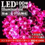 AKIRARIの10m、100球の桜LEDイルミネーション。屋外防雨仕様で、高輝度。クリスマス、ハロウィン、バレンタインデーなど様々なイベントに最適。コントローラー付きで、黒いコードとピンク色のデザイン。