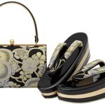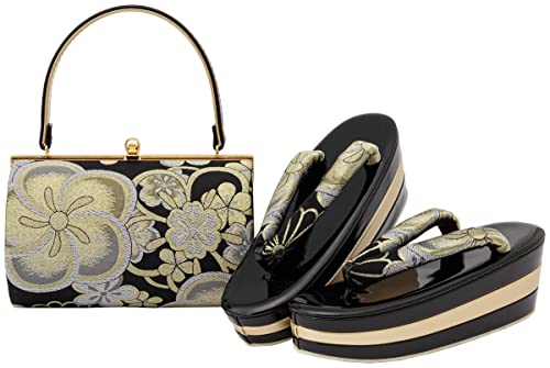 ソウビエンの草履バッグセットは、成人式や振袖に最適な盛装アイテムです。厚底仕様で三枚芯を使用し、帯生地のデザインが特徴。フリーサイズで、捻り梅×ゴールド・ブラックの円型スタイル。
